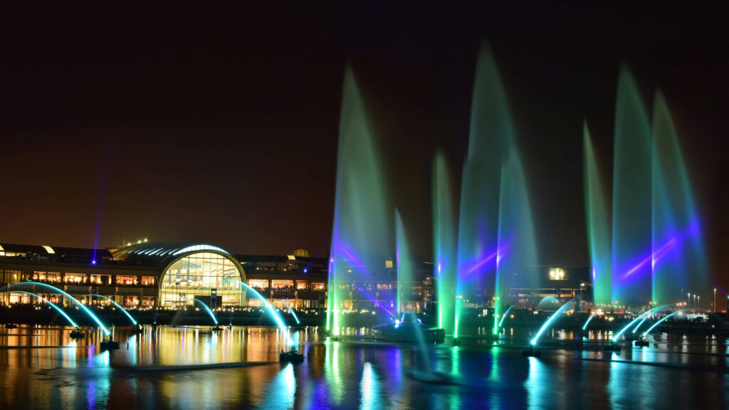 You can shop at the mall, dine at waterfront restaurants, take walks along promenades, enjoy boating at the marina, watch the IMAGINE water and light show, and visit parks, cinemas, and cultural venues.
